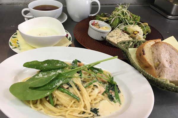 サラダ仕立て前菜・野菜のスープとパン・本日のパスタ・ランチドリンク